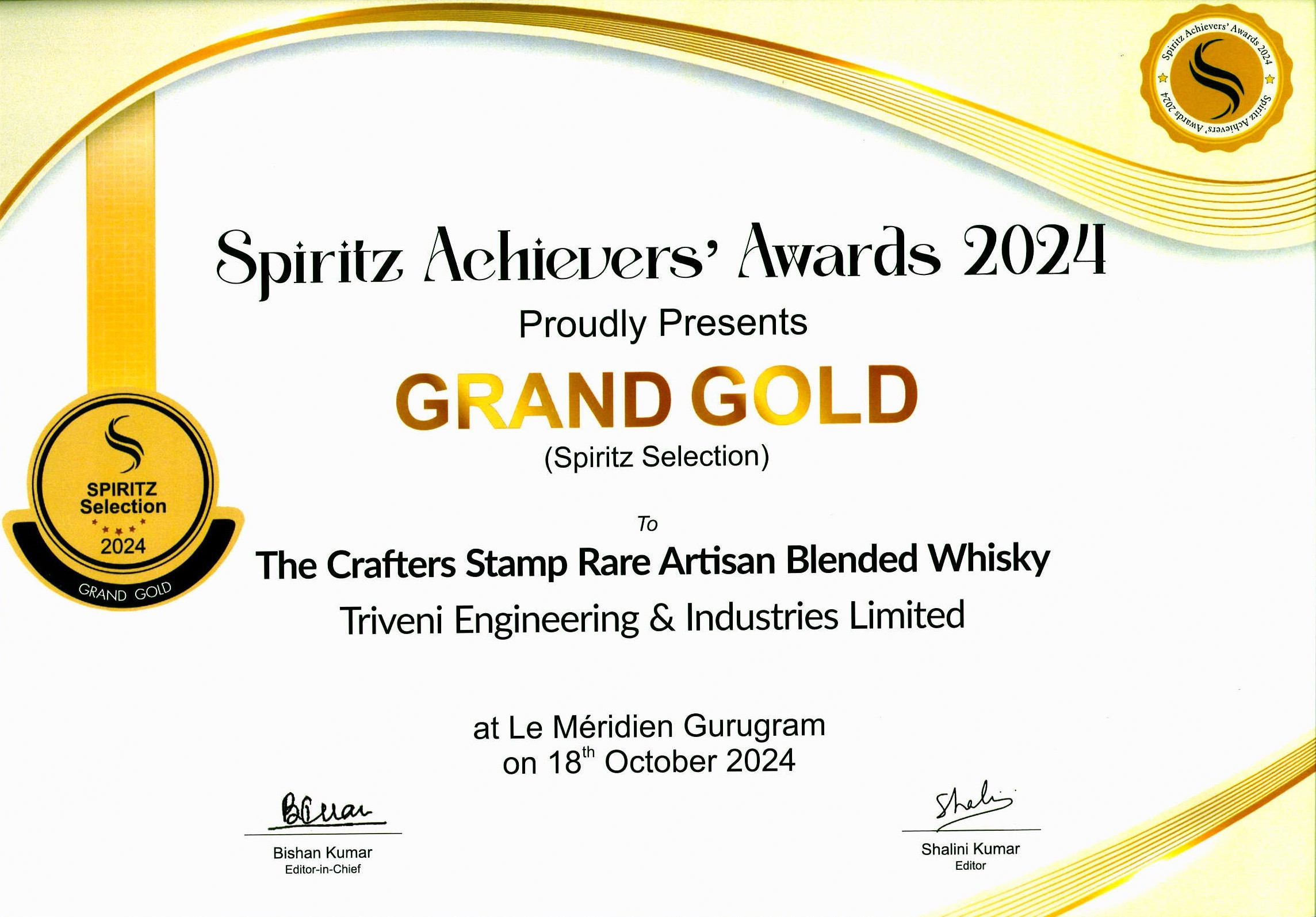 त्रिवेणी इंजीनियरिंग एंड इंडस्ट्रीज़ लिमिटेड ने अपने प्रीमियम व्हिस्की ब्रांडों के लिए स्पिरिट्ज़ अचीवर्स अवार्ड्स 2024 में पाया सम्मान